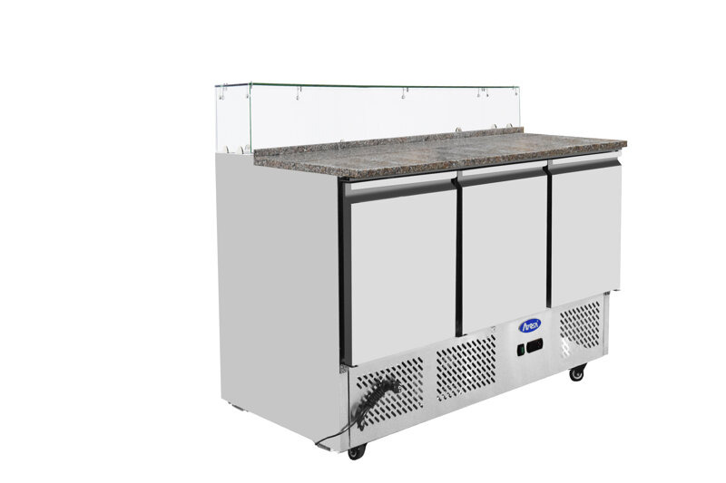 ATOSA | La Saladette 3 ante con vetrina portacondimenti 7 x GN 1/3 ATOSA ESL3864-GR ha una capacità di 380 litri e funzione di sbrinamento automatico. L'intervallo di temperatura è compreso tra -2°C e +8°C. La struttura è realizzata in acciaio inox, mentre piano di lavoro, di 325 mm, è in marmo. Le dimensioni del prodotto sono 1380 x 700 x 947 mm (L x P x A). Le guarnizioni delle porte sono fissate magneticamente, porta a chiusura automatica con bloccaggio verso l’esterno. Viene utilizzato il refrigerante ecologico R600a. Il prodotto ha classe climatica 4. Articolo Tropicalizzato. Spessore di coibentazione 35mm. Dotato sia di ruote che di piedini. | Tropicalizzato | Piano di lavoro in Teflon | Configurazione 12 x GN 1/3 | Refrigerante ecologico R290